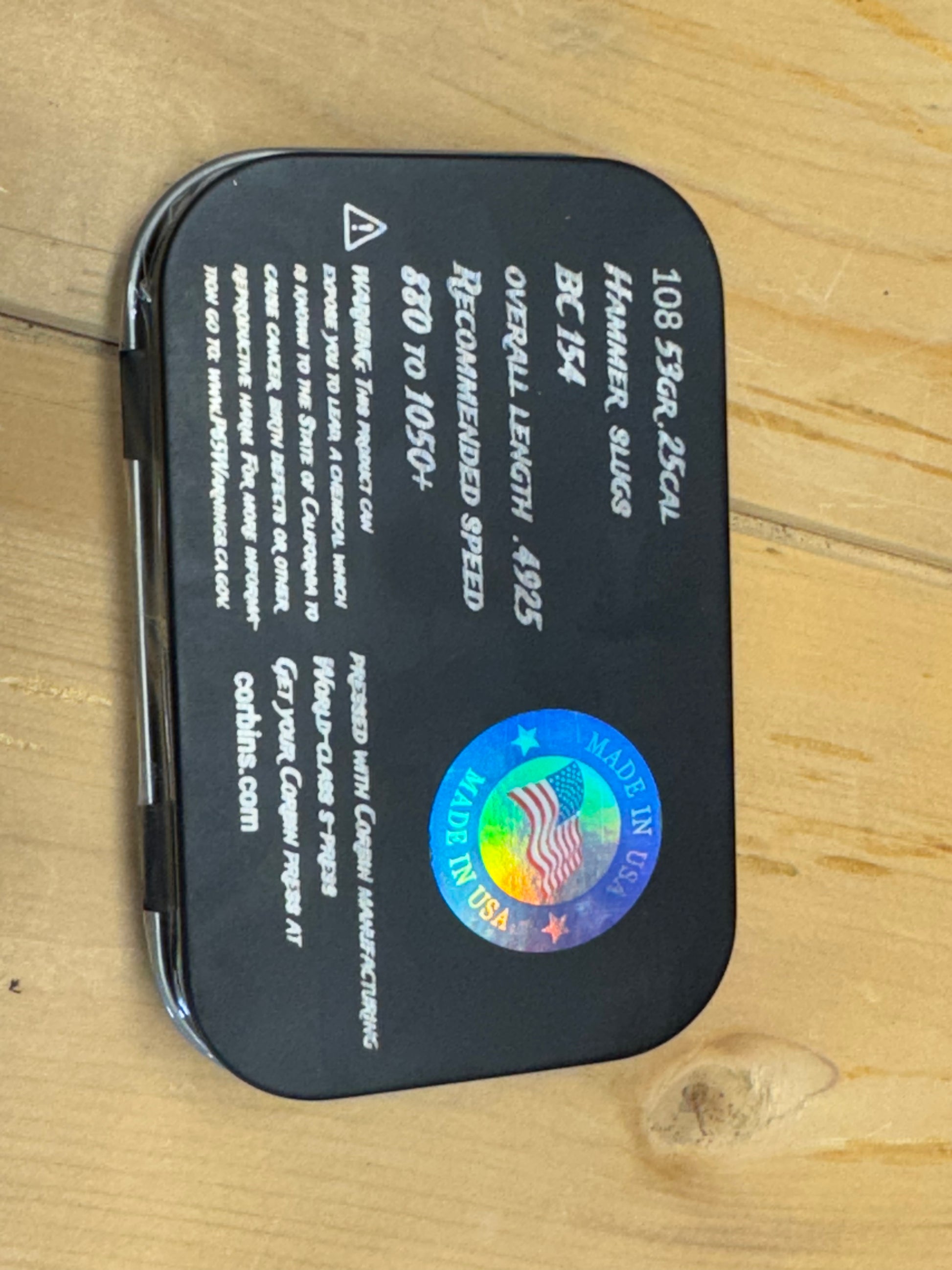new twenty-five caliber line of flat Nose slugs these slugs are within a tenth of a grain of advertised, weight and fly, extremely stable they have a BC of .157 overall length is .4985 and recommended speeds are from 880 to1000+