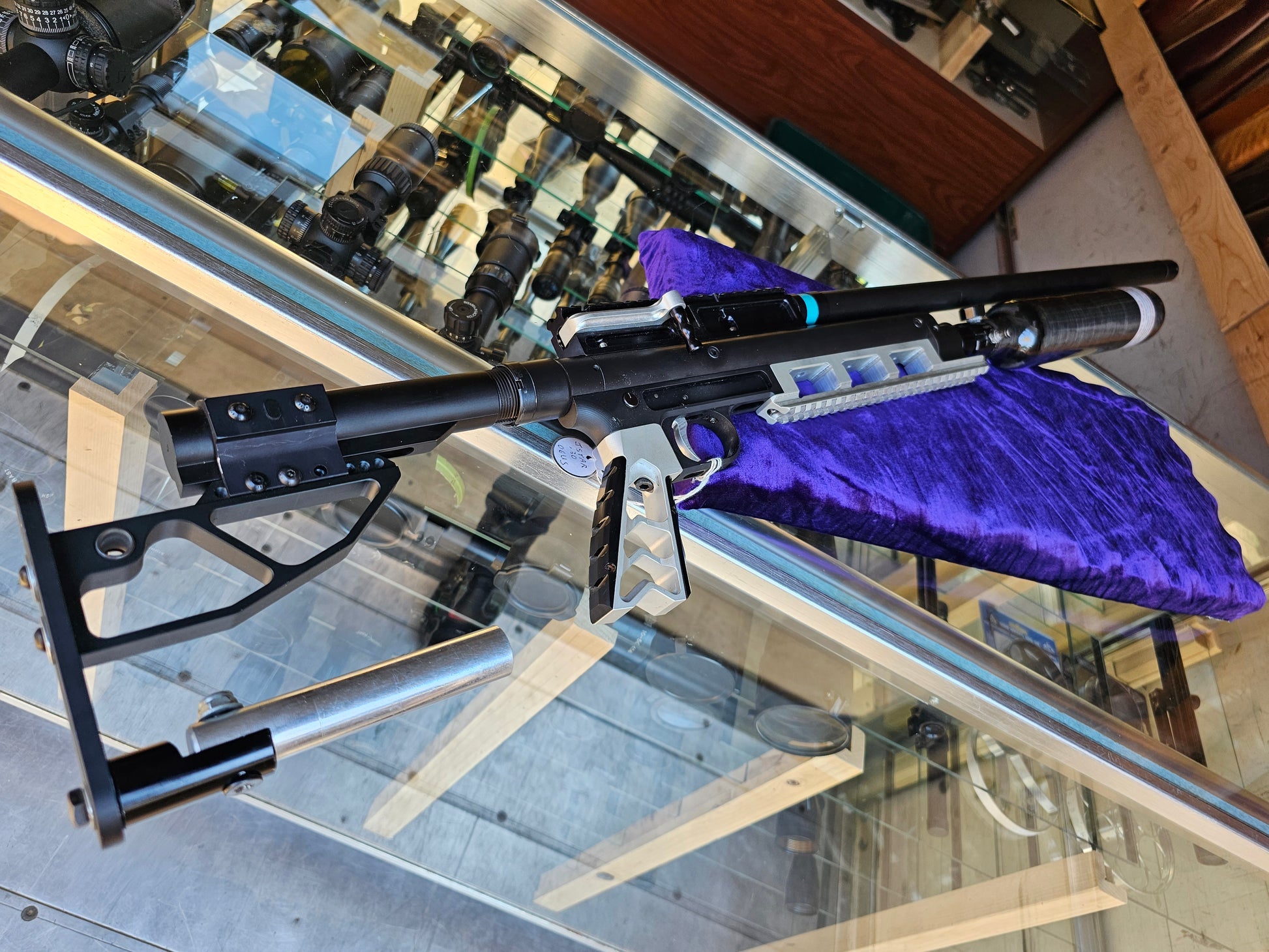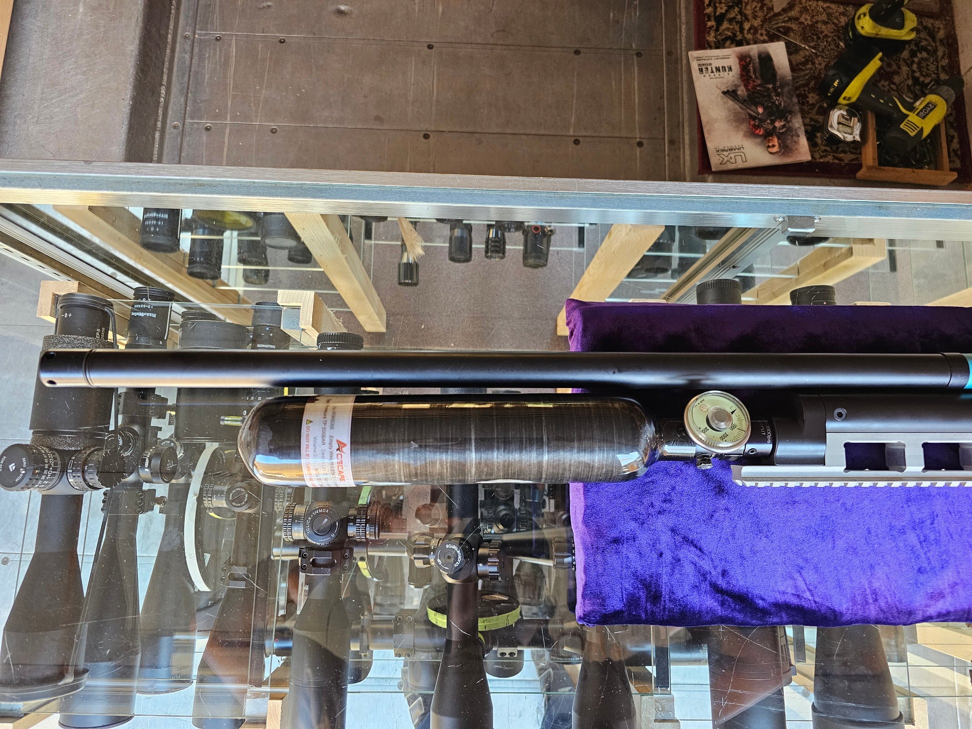 Full size rifle with 3 mag holder and 480cc carbon fiber bottle. Includes 3 of the new style aluminum magazines. This air rifle is a proven shooter with either the 44.74 or 50.15 grain JSB pellets. 1" ten shot groups at 100 yards. Currently shoots the 50.15 grain at 960 fps.