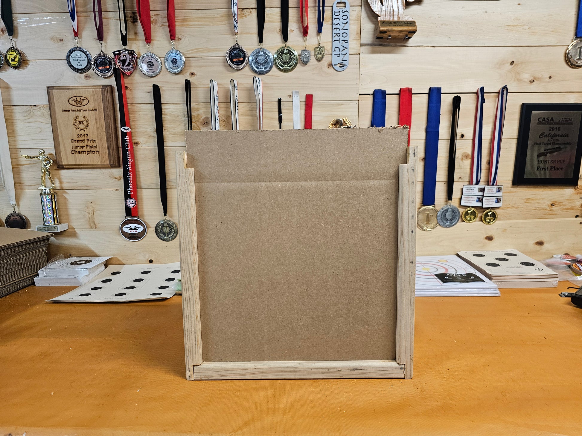 The outside of the kiln dried cedar target box is 5.5" deep,14.5" wide x 16" tall. The cardboard backer and target paper size is up to 12" x 14". The silent trap target box comes filled with packed sawdust as the trapping medium. This target pellet/bb trap is designed to stop projectiles up to 8 foot lbs of energy. It can easily be upgraded to higher foot lbs. (up to 30fpe) by changing the sawdust medium to a rubber garden mulch. (shredded tires). And up to 100fpe with a steel sheet metal liner installed on the inside back before filling with the rubber mulch.